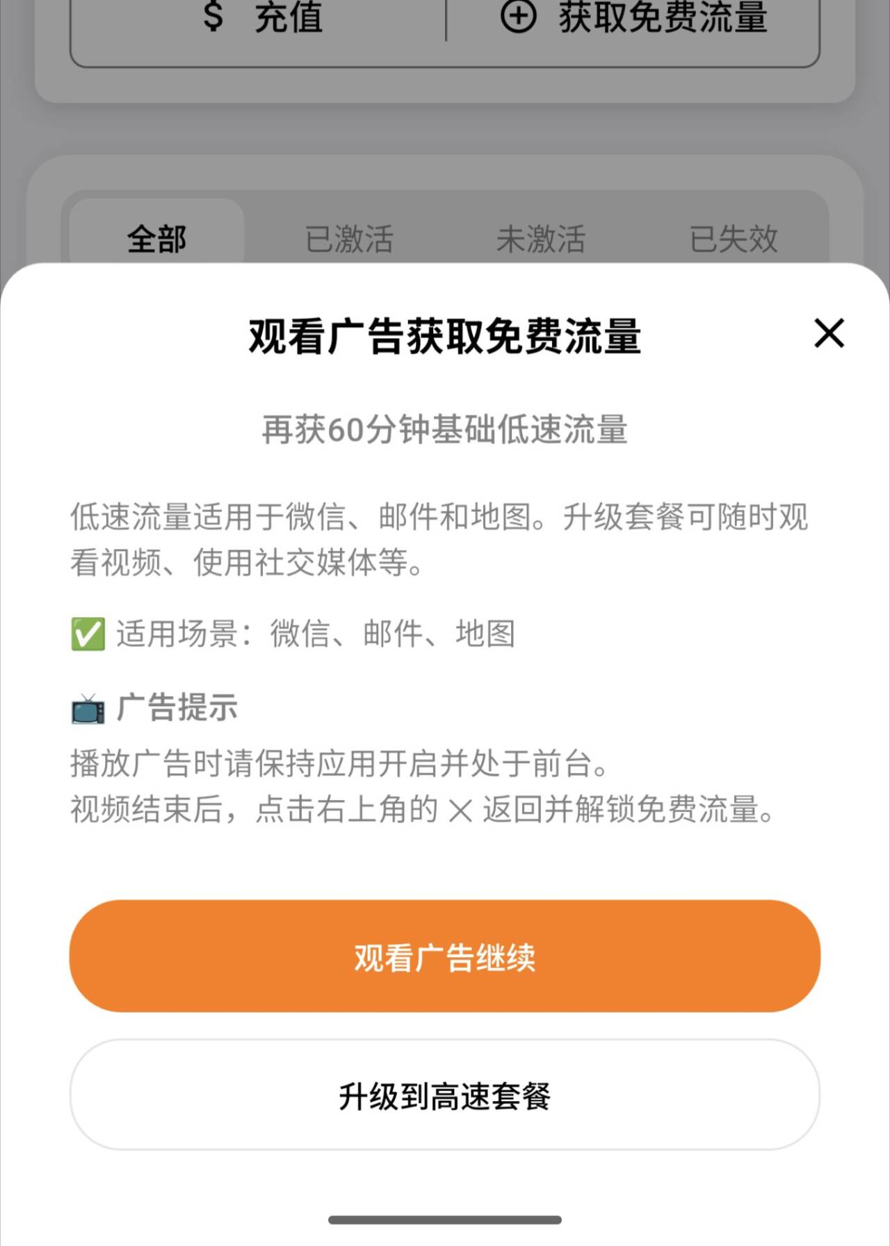 低速流量适用于微信、邮件和地图。升级套餐可随时观看视频、使用社交媒体等。