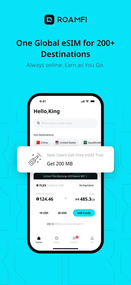 One global eSIM. Always online, Earn as You Go.